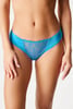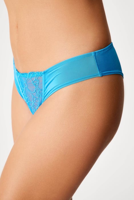 Brazil σλιπ Anya I σε μια εντυπωσιακή μπλε απόχρωση. Οι γοφοί και το πίσω μέρος καλύπτονται από διακριτικά γυαλιστερές μικροΐνες, ενώ το καβάλο είναι διακοσμημένο με πλούσια λουλουδάτα κεντήματα.