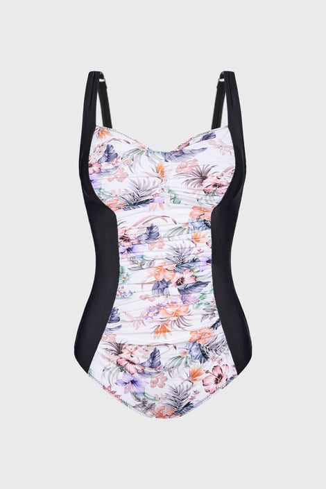 Το ολόσωμο μαγιό Hawaii κολακεύει τις γεμάτες καμπύλες. Το μπροστινό μέρος είναι επενδυμένο με ελαστικό ύφασμα μαγιό με εφέ σμίλευσης που λειαίνει και ενοποιεί το περίγραμμα του σώματος. Ο συνδυασμός του μαύρου με το φλοράλ μοτίβο θα σας κάνει οπτικά πιο αδύνατη.