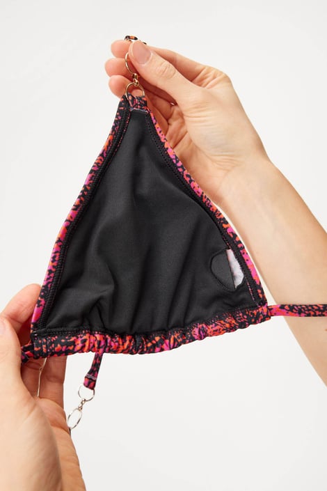 Το πάνω μέρος του μπικίνι Kyah είναι ένα απλό τριγωνικό σουτιέν, τα cups μπορούν να μετακινηθούν στην περίμετρο κατά βούληση. Με αφαιρούμενα μαξιλαράκια, είναι κατάλληλα για κάθε στήθος. Με δέσιμο στην πλάτη και πίσω από το λαιμό. Διακοσμημένο με μεταλλικούς κρίκους στο μπροστινό μέρος. Από το ατελιέ της Astratex.
