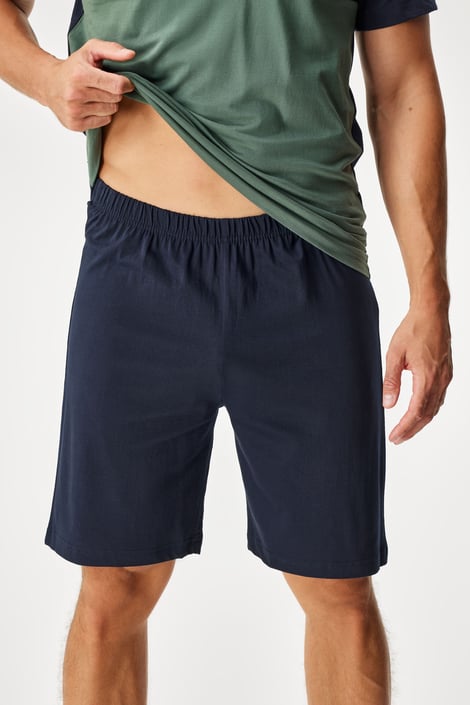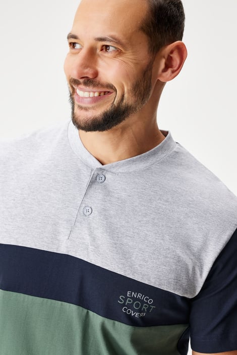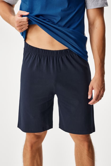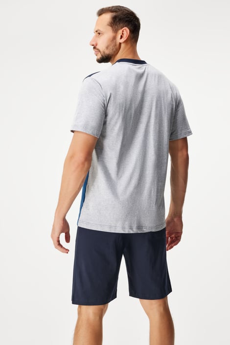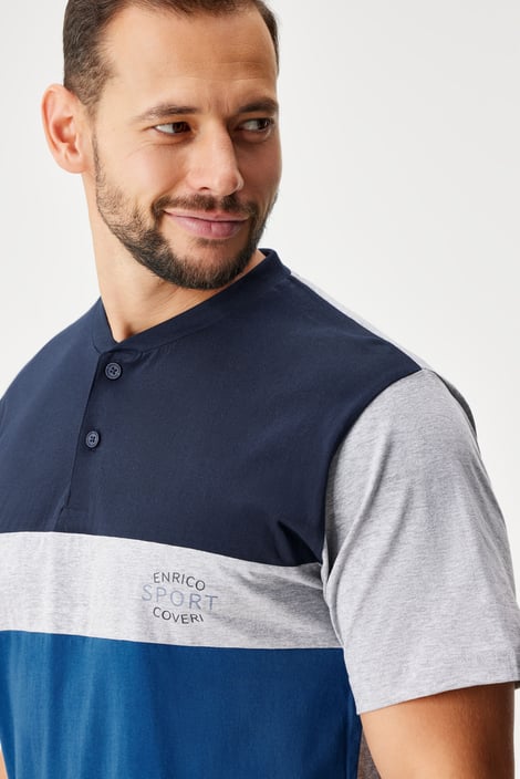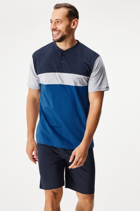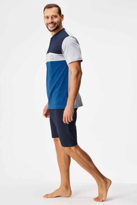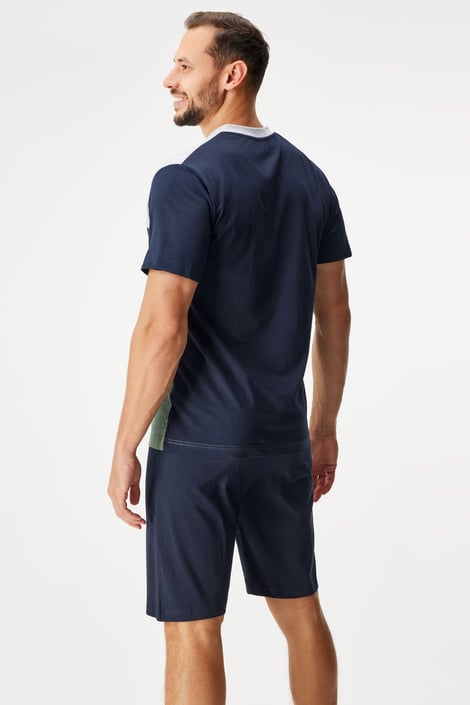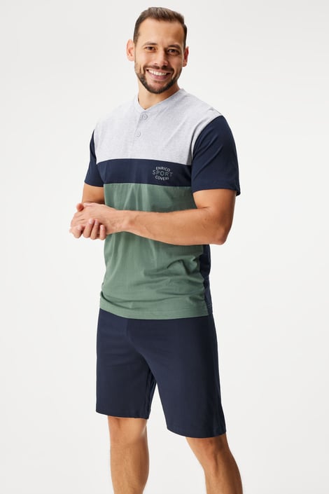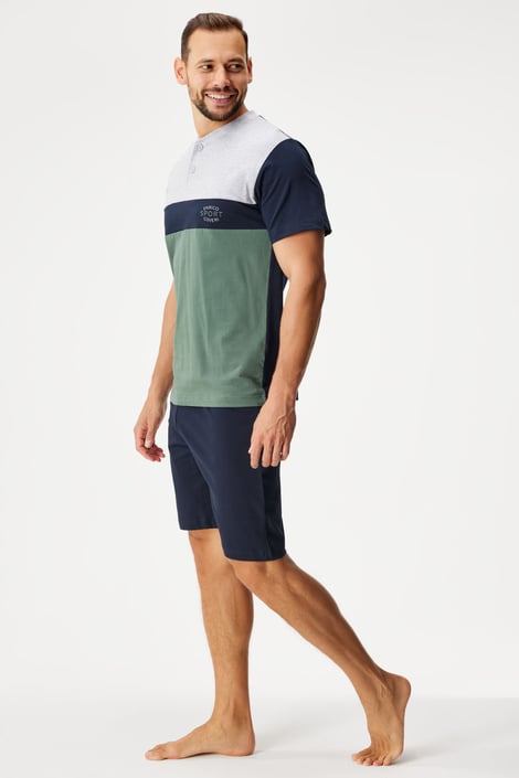 Χάρη στο μαλακό βαμβάκι, η ανδρική πιτζάμα Zayden είναι εξαιρετικά άνετη στο σώμα. Το μπλουζάκι σε σπορ σχέδιο είναι διακοσμημένο με ρίγες σε αντίθεση, το κοντό σορτς είναι μονόχρωμο.