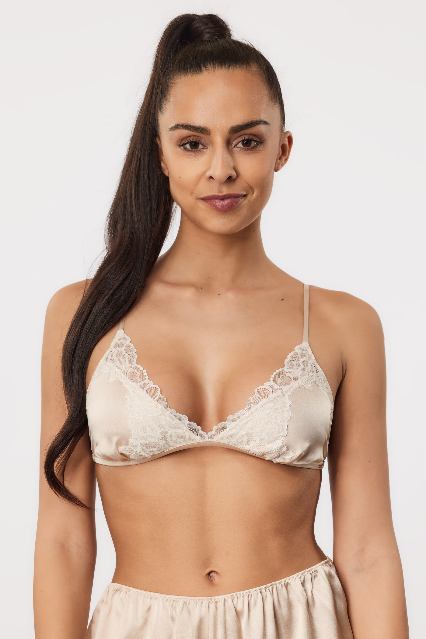 Το ρομαντικό σουτιέν Thallo χωρίς ενίσχυση με υψηλή περιεκτικότητα σε μετάξι θα στολίσει υπέροχα τόσο τα μεγαλύτερα όσο και τα μικρότερα στήθη. Ο συνδυασμός του λείου σατέν και της απαλής δαντέλας είναι πολύ εντυπωσιακός. Ο σχεδιασμός χωρίς μπανέλες είναι απόλυτα άνετος.
