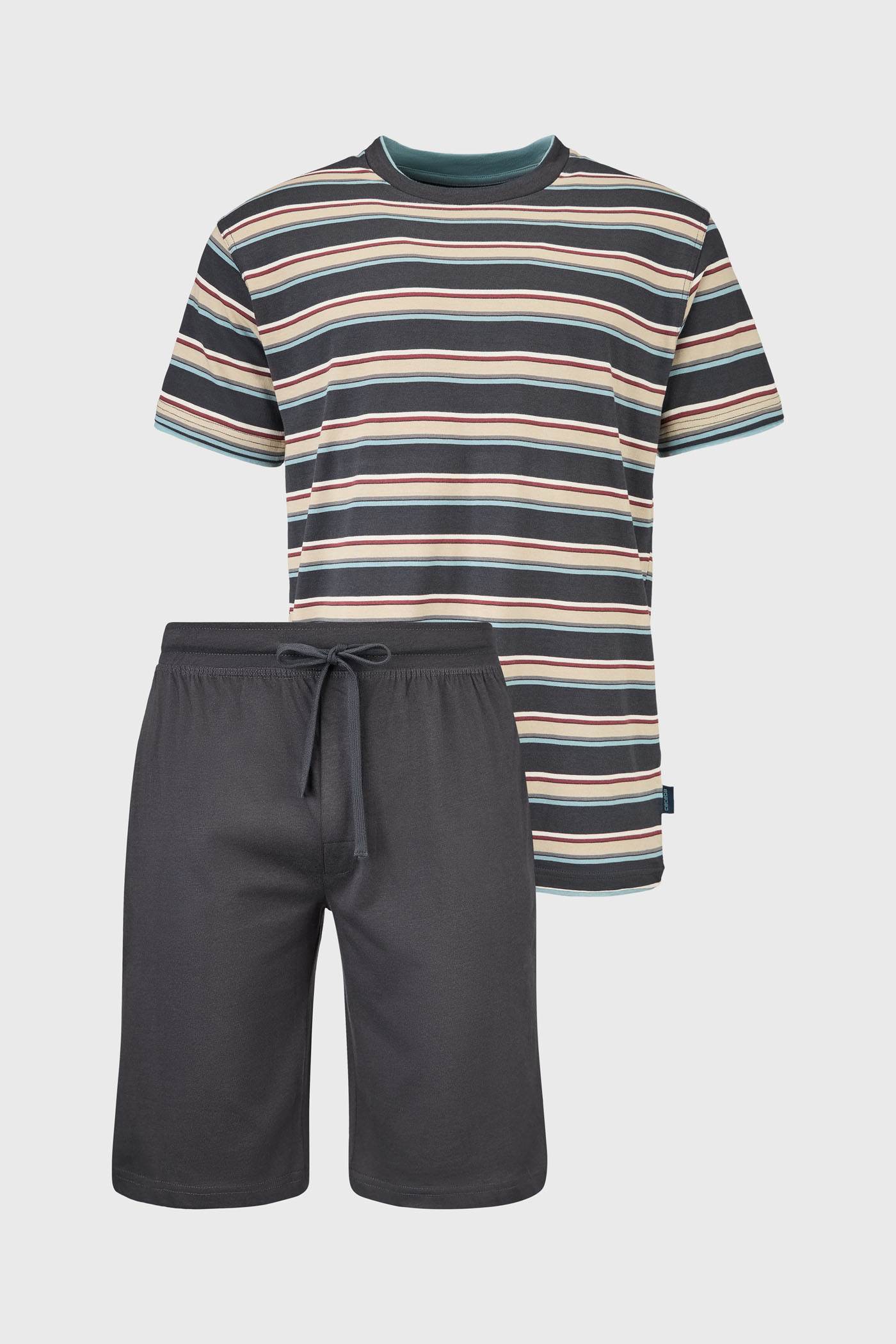 Βαμβακερή ανδρική πιτζάμα Rony από μαλακό πλεκτό ύφασμα για άνεση κατά τη διάρκεια της νύχτας. Το ριγέ κοντομάνικο μπλουζάκι συνδυάζεται με μονόχρωμο σορτς. Διαθέτει πρακτικές τσέπες στα πλαϊνά, ελαστική μέση και κορδόνι περίσφιξης.