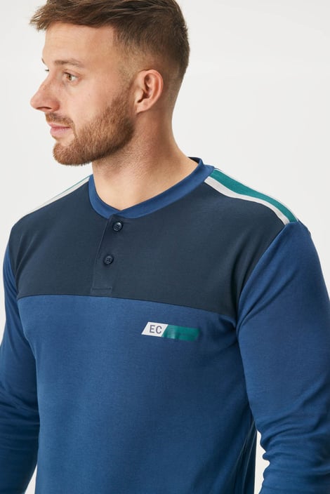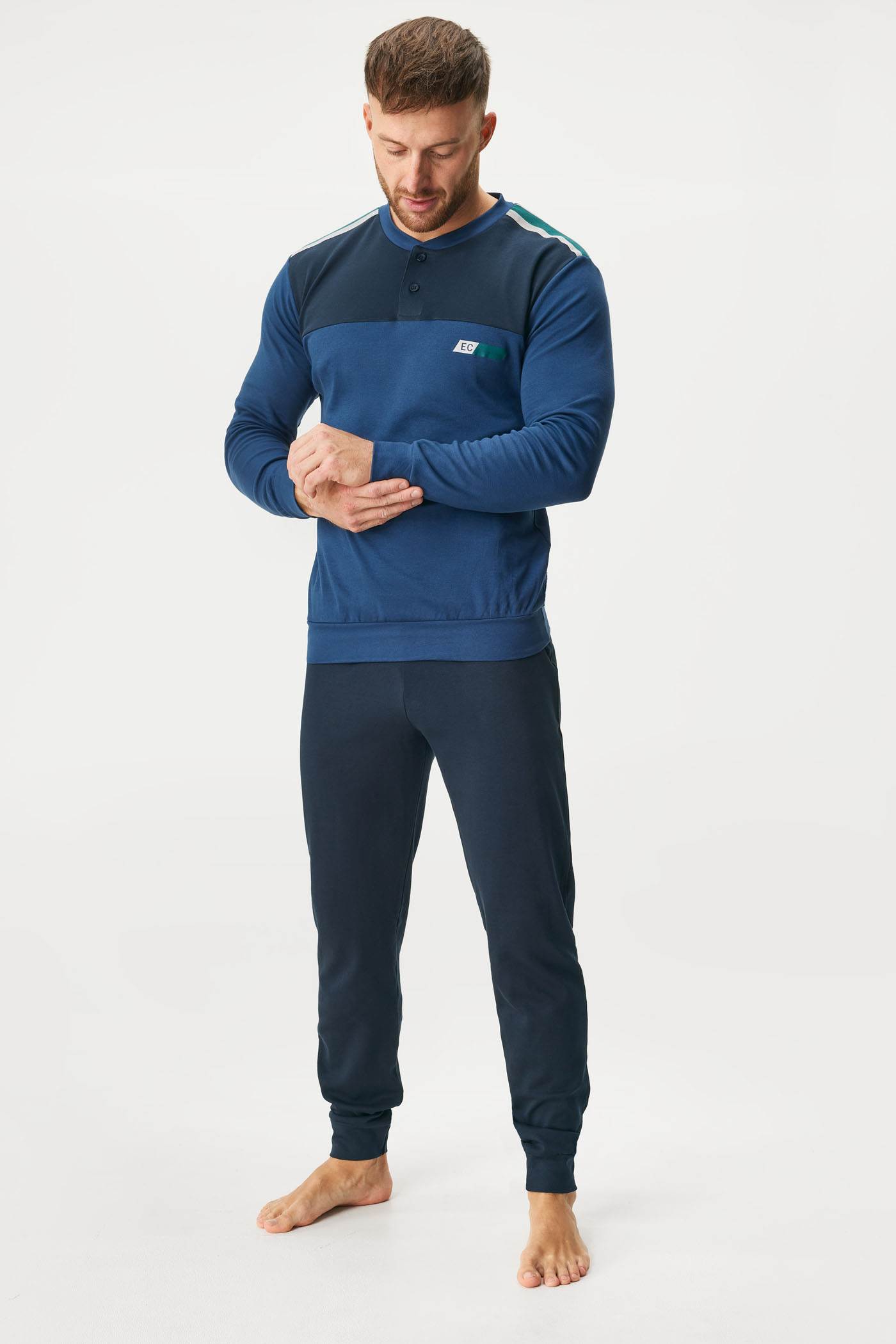 Η βαμβακερή πιτζάμα Bjorn είναι κατασκευασμένη από μαλακό πλεκτό ύφασμα για άνεση κατά τη διάρκεια της νύχτας. Το μακρυμάνικο μπλουζάκι έχει λαιμόκοψη με κουμπιά, ενώ το μακρύ παντελόνι έχει ελαστική μέση. Τα άκρα είναι τελειωμένα με μανσέτες.