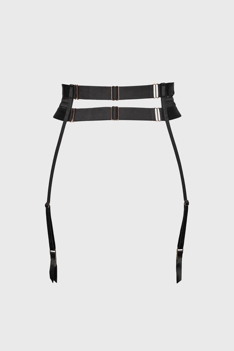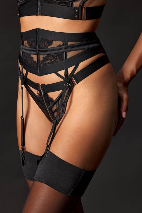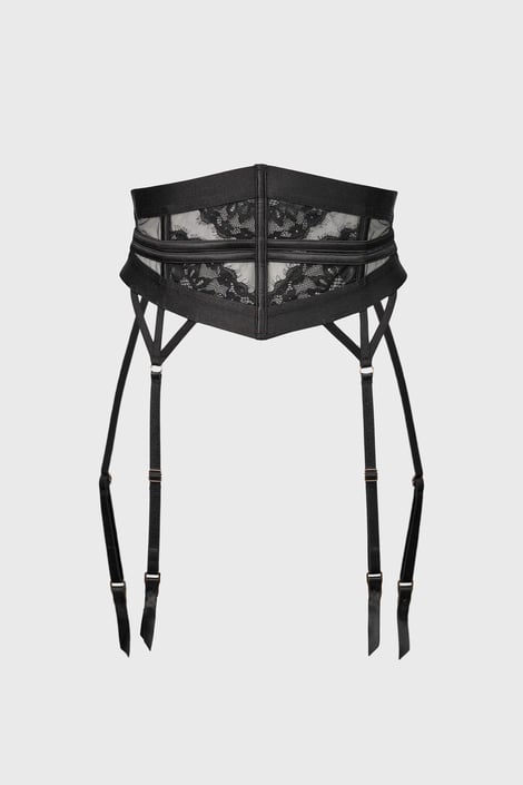 Ζώνη ζαρτιέρας από λεπτό δίχτυ και δαντέλα. Ενισχυμένη με μπανέλα στο μπροστινό μέρος, δύο φαρδύτεροι ιμάντες με δυνατότητα ρύθμισης του μήκους και κλείσιμο με κόπιτσες στο πίσω μέρος.
